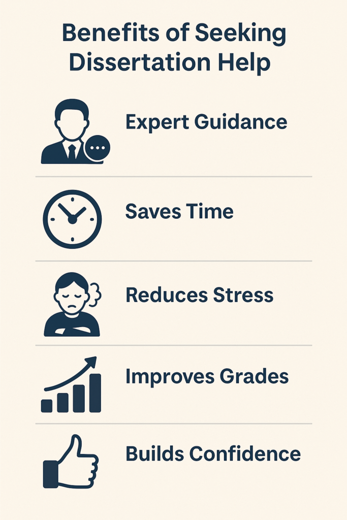 The pressure of dissertation writing can be overwhelming. Seeking dissertation help allows you to share the workload, receive support, and maintain peace of mind. Having structured assistance reduces anxiety and helps you focus on producing quality work instead of worrying about deadlines.