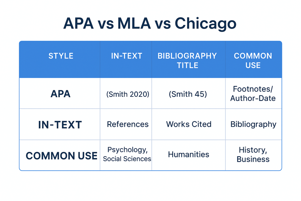To make it easier for students, it helps to compare the three styles side by side. APA is the preferred style in psychology and social sciences, using an author-date system and a References page. MLA dominates the humanities, requiring author-page citations and a Works Cited list. Chicago is flexible, allowing either footnotes with a bibliography or an author-date system with a reference list. For instance, an APA book reference looks like Smith, J. (2020). Psychology in modern education., while MLA would cite it as Smith, John. Psychology in Modern Education. 2020., and Chicago would list it as Smith, John. Psychology in Modern Education. City: Publisher, 2020.