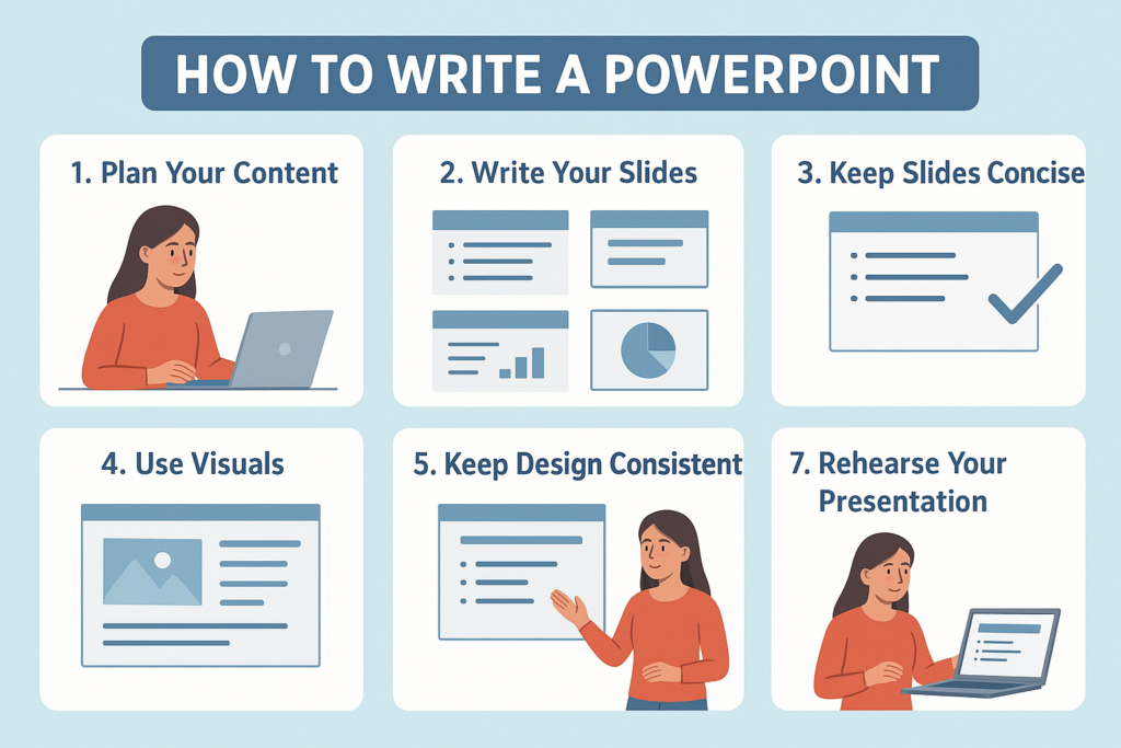 Once you have a plan, it’s time to actually write your slides. Writing for PowerPoint is very different from writing essays or reports. An essay allows you to use paragraphs and long explanations, but a PowerPoint presentation demands clarity, brevity, and visual appeal.