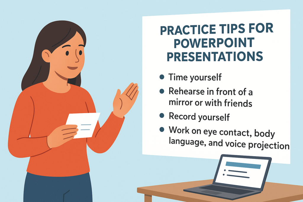 Many students mistakenly believe that preparing the slides is enough, but your slides are only supporting tools. The real value comes from your spoken words, your body language, and how you interact with your audience. By rehearsing, you develop a natural rhythm, minimize nervousness, and learn how to stay within the time limits set by your professor or event organizer.