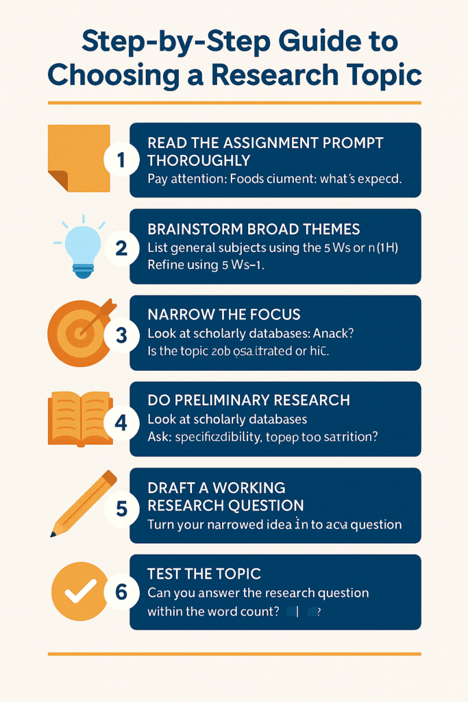 The best research papers come from students who are genuinely curious about their subject. That curiosity begins with selecting a topic that sparks interest, raises important questions, and connects to ongoing academic discussions. By carefully following a structured process—understanding the assignment, brainstorming ideas, narrowing your focus, conducting preliminary research, and drafting a research question—you can avoid common mistakes and create a strong foundation for success.